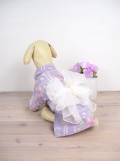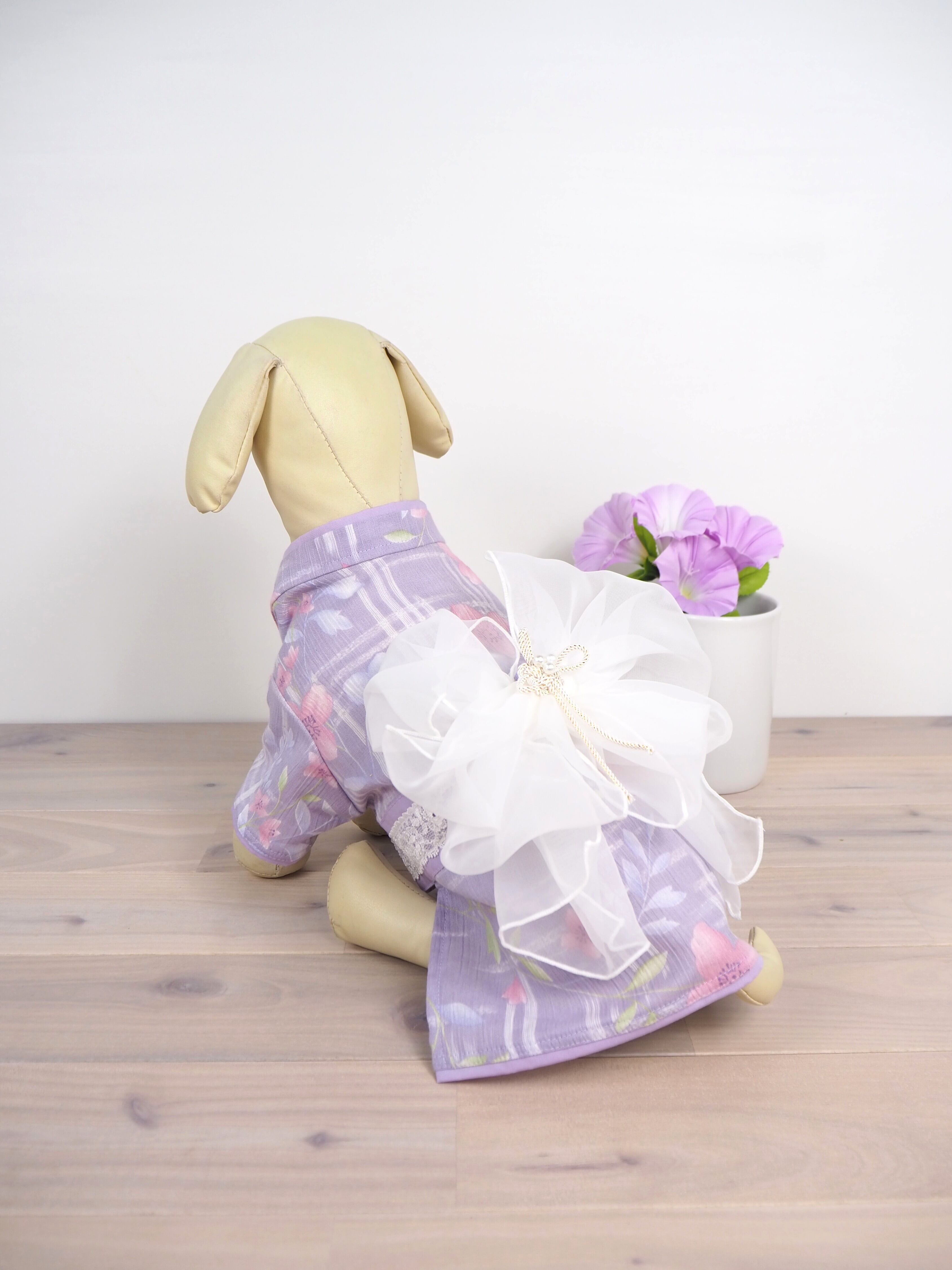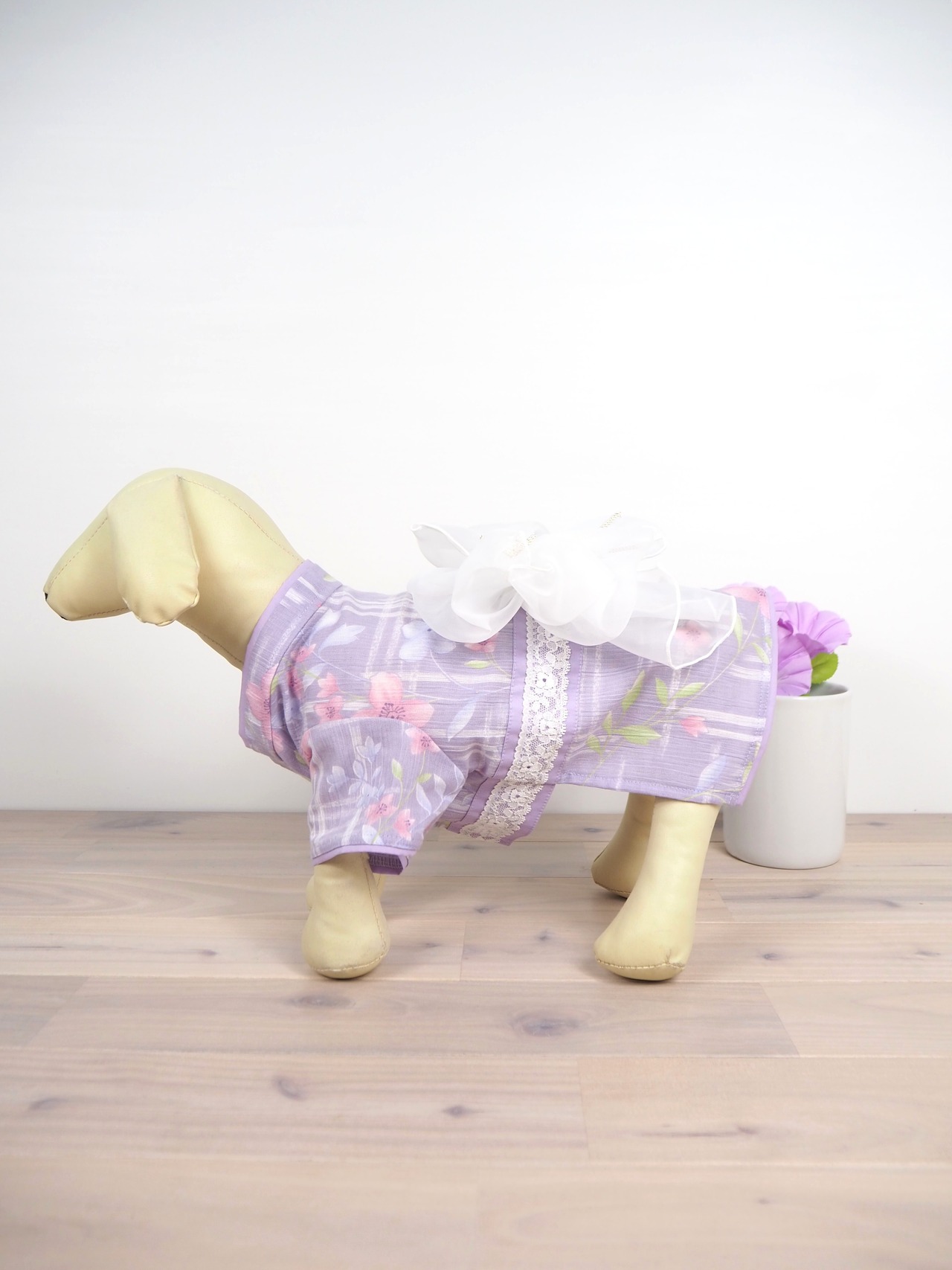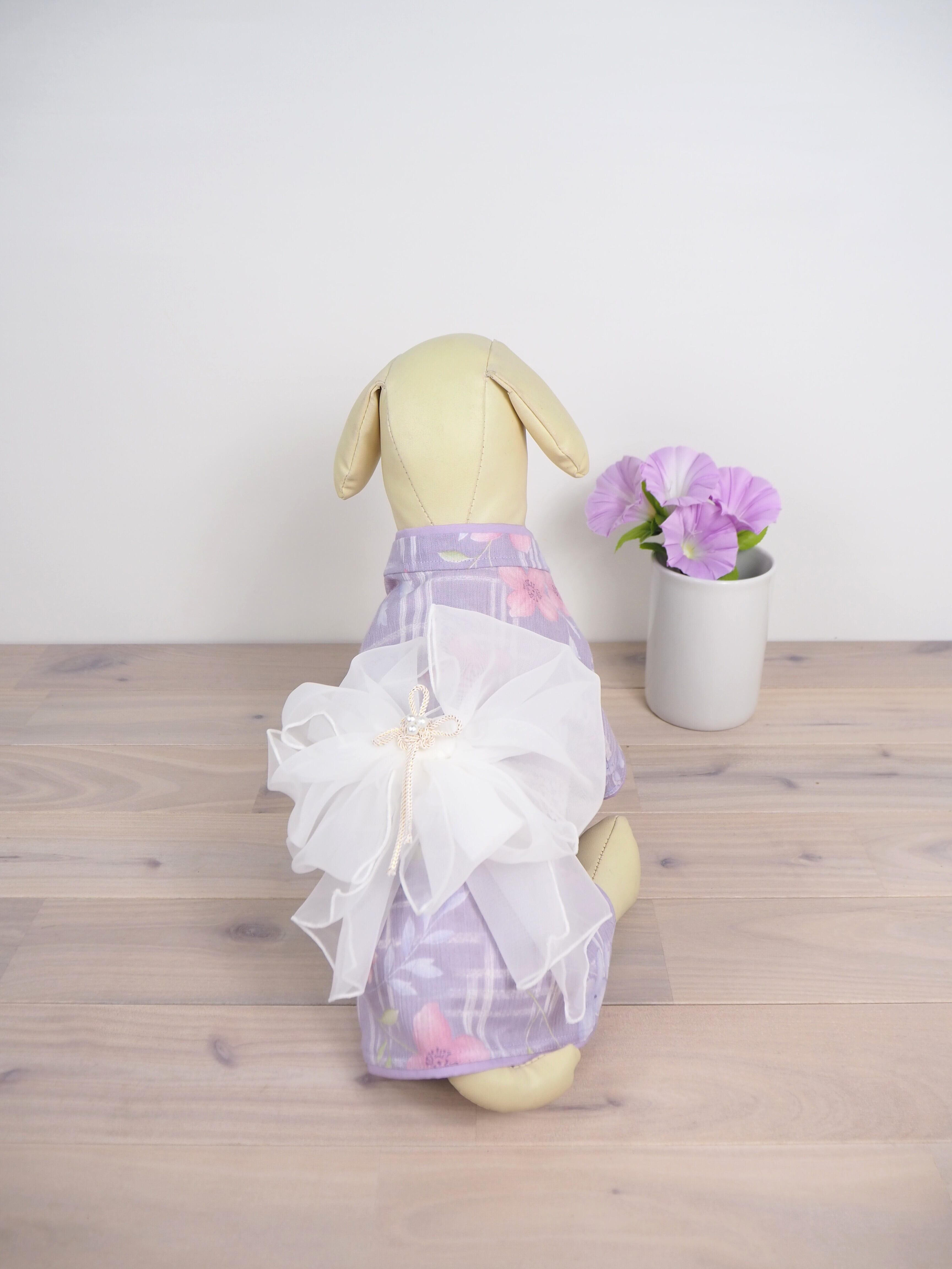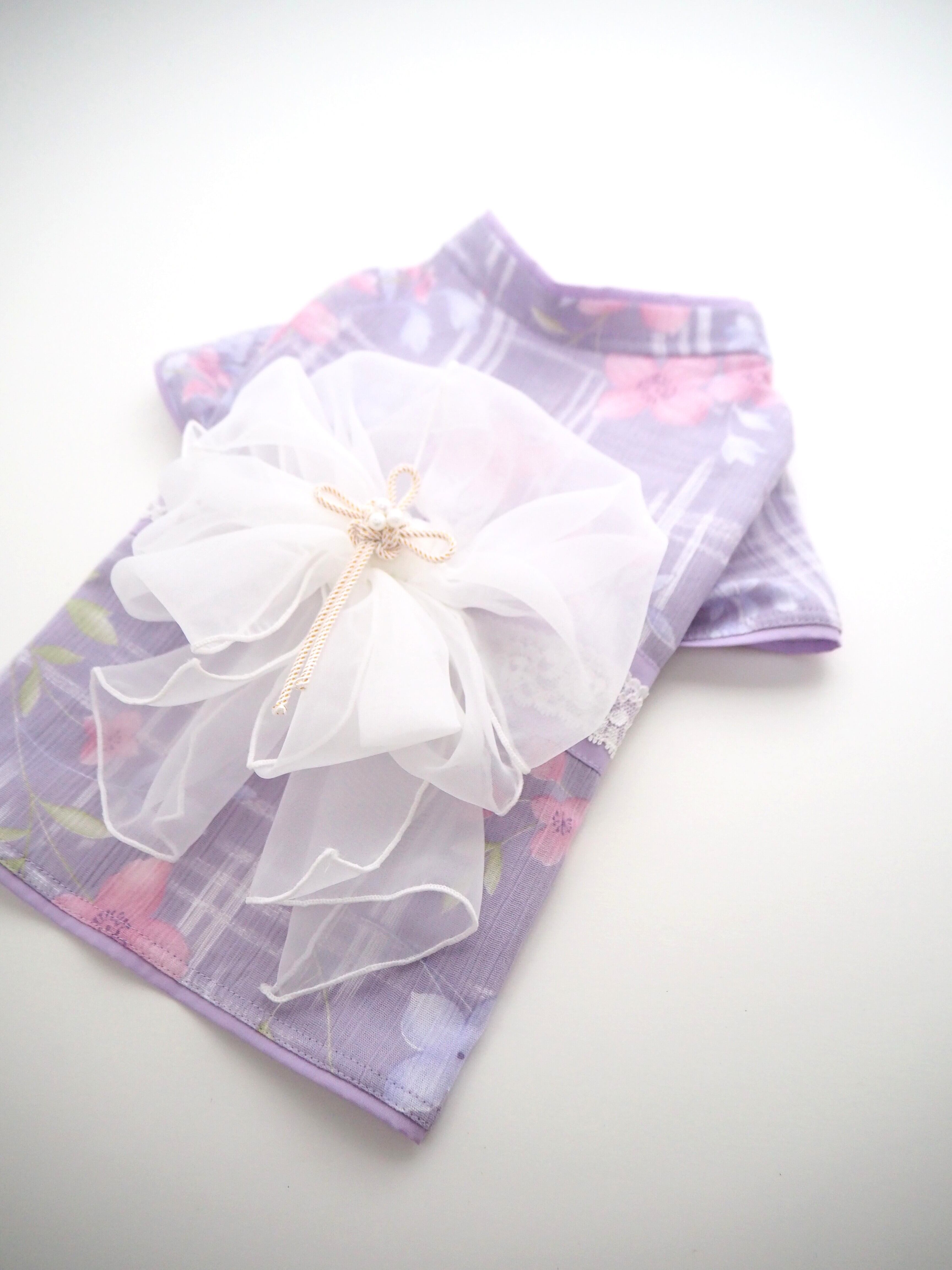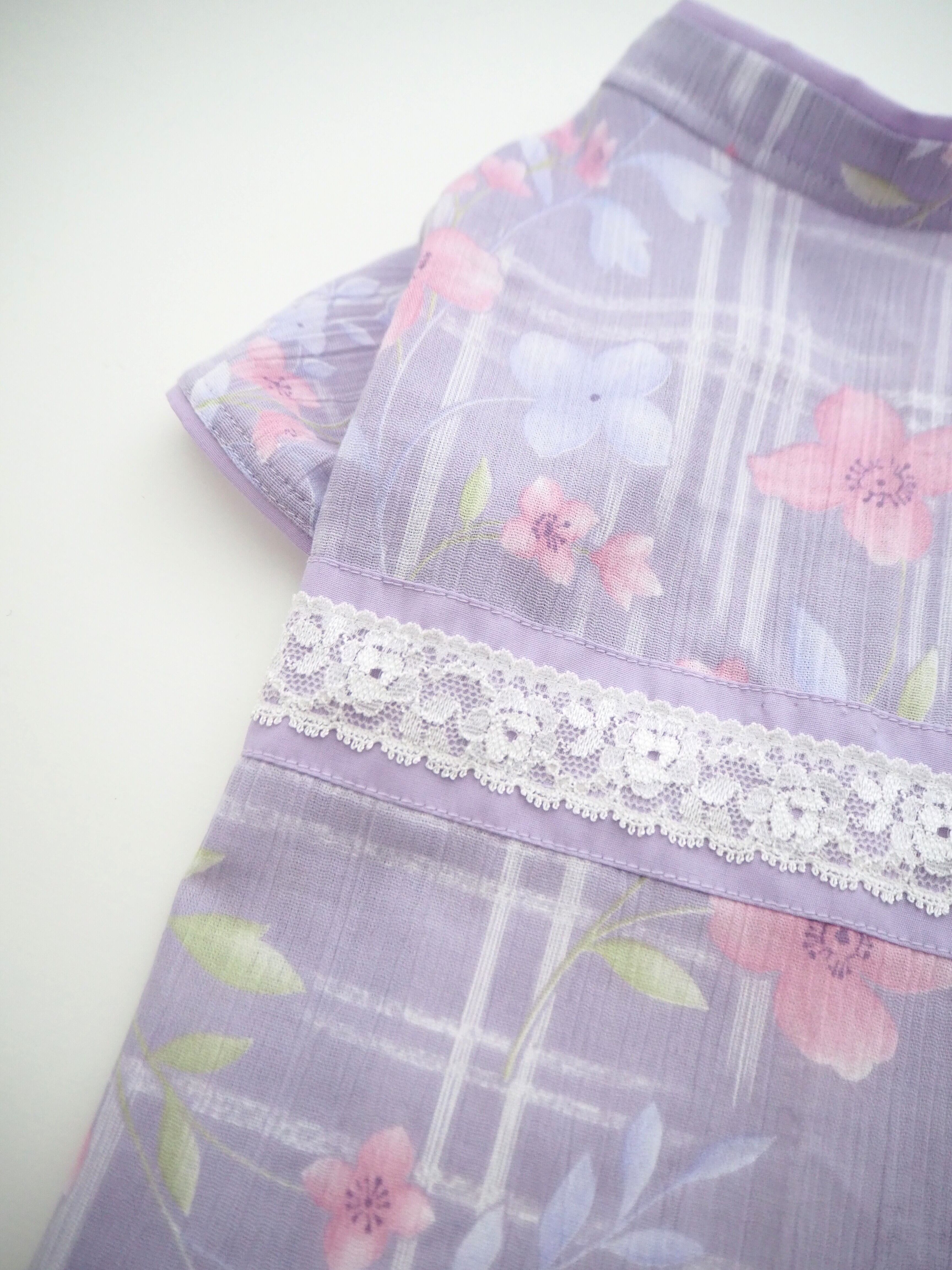 やわらかなふじ色の生地に、帯締め風にレースを使い、レトロモダンに仕上げました。