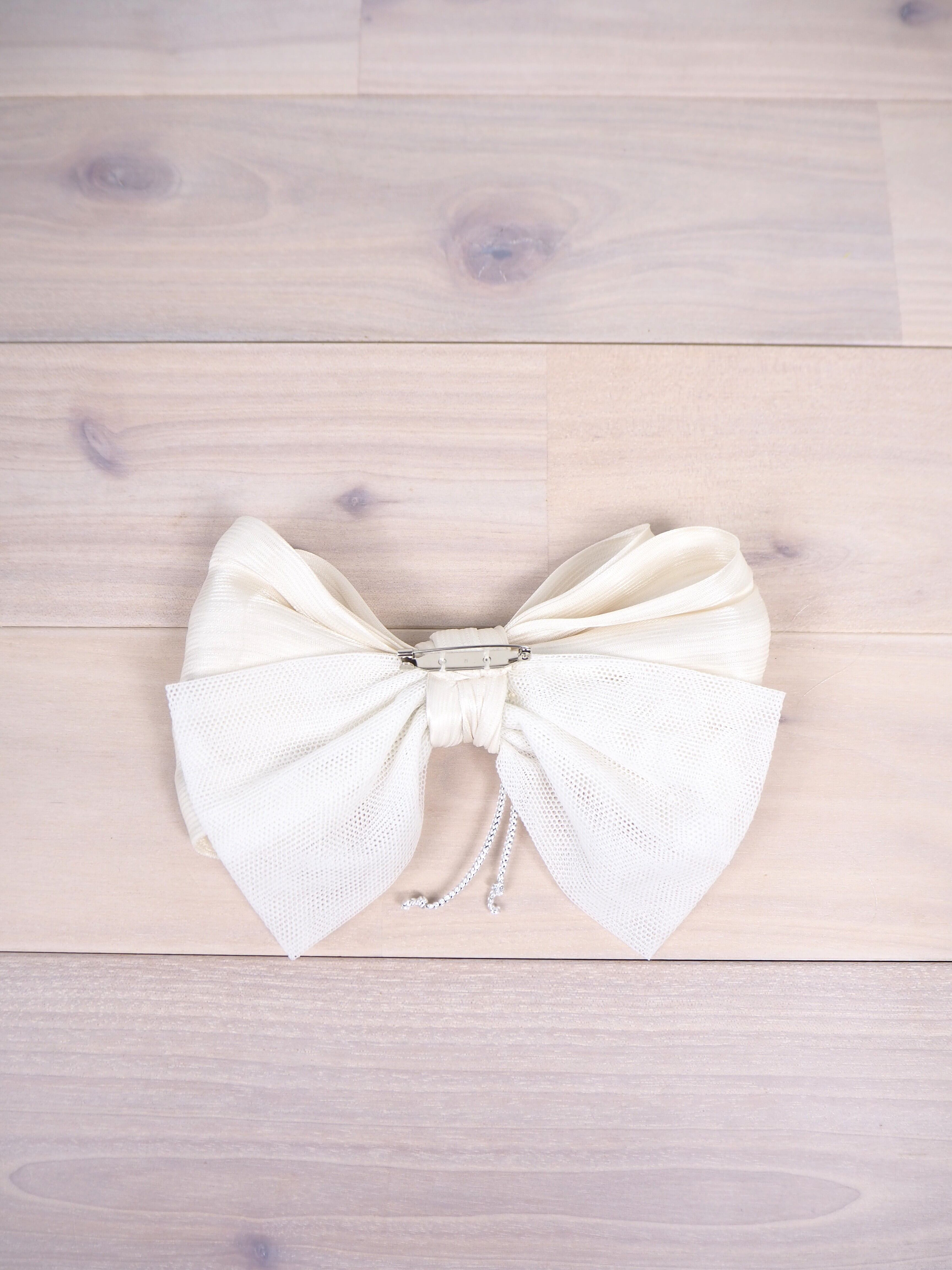 ツヤのある生地を立体的なリボン帯にして、シルバーの組紐で飾りをつけてポイントにしました。